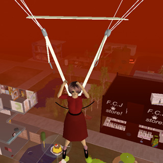そんでもって、もうすぐ地面ってときに、パラシュートがひらき、ゆっくり落ちていきますの。